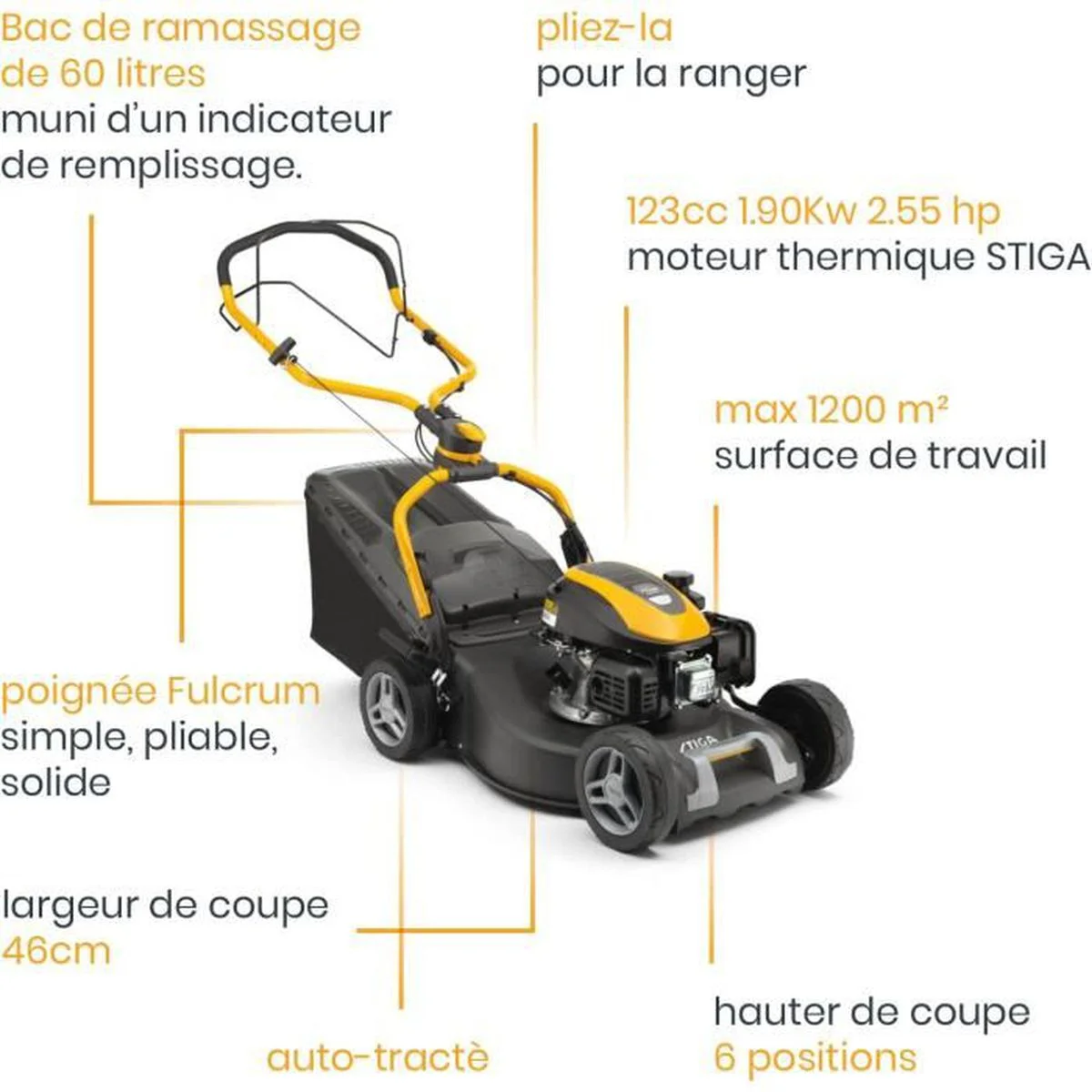 Hochleistungsrasenmäher, geeignet für lange und anspruchsvolle Arbeiten – Innovativer ergonomischer Griff, während des Mähens in Höhe und Neigung verstellbar, Zugführung – Schnittbreite 46 cm, zwei Schnittmodi (Fangkorb und Heckauswurf), Schnitthöhe in 6 Positionen (22–65 mm) über einen Griff einstellbar – Motor mit cm3, Leistung 1900 W, Seilzugstart