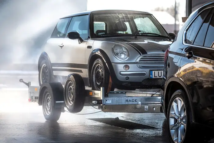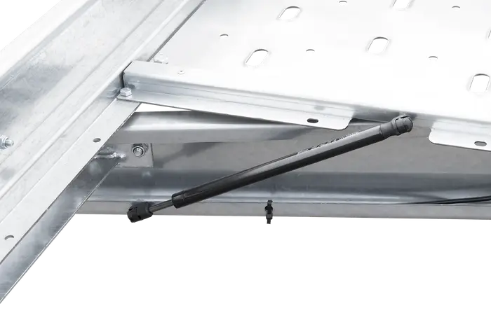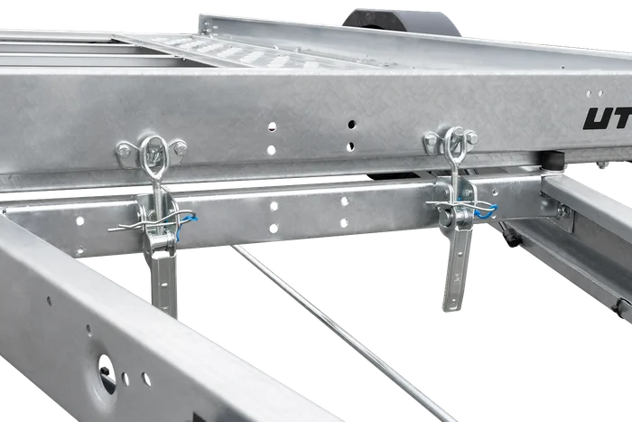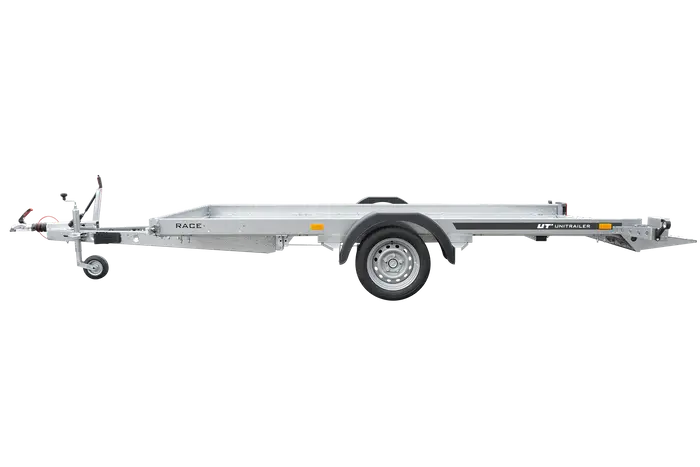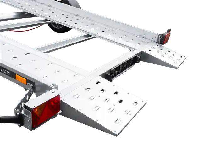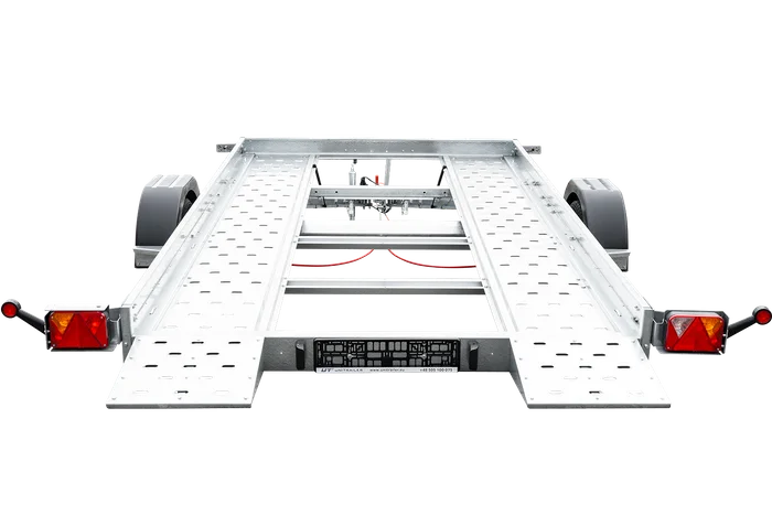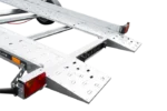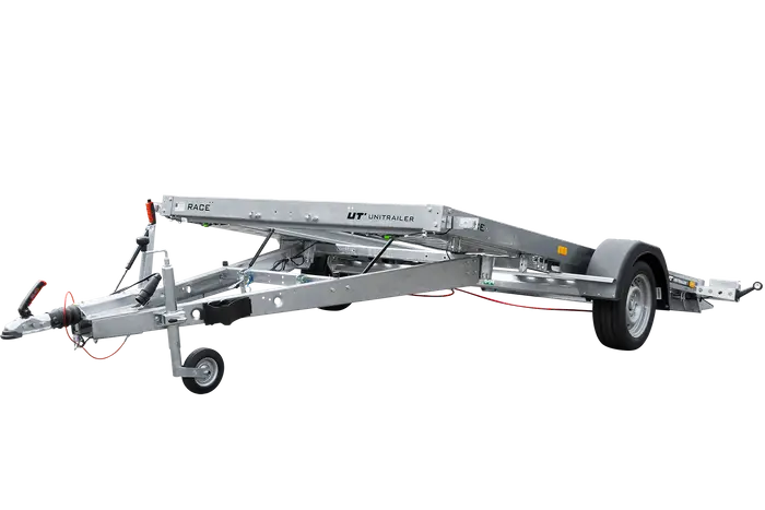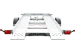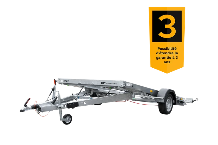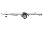 Einachsiger Abschleppwagen für den Transport von kleinen Leichtfahrzeugen und Maschinen. Maximale Ladekapazität: 1156 kg, Gesamtgewicht: 344 kg. LOHR-Boden, neigbare Ladefläche, gestützt durch 2 hydraulische Stoßdämpfer.